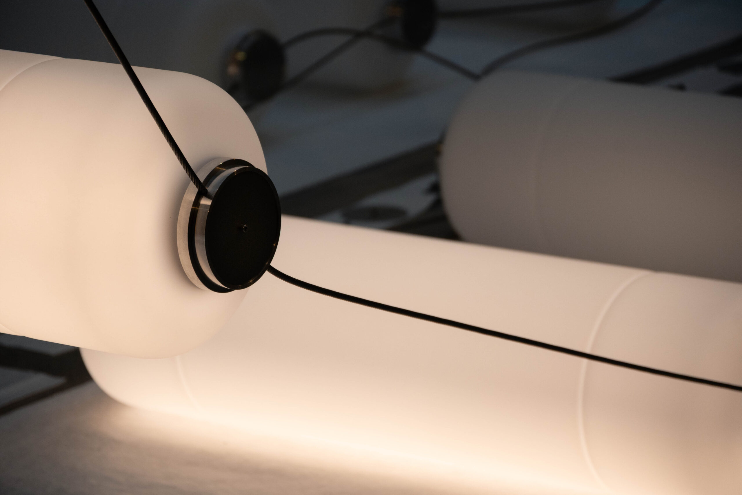 OPION lighting can be integrated into interiors in two distinct ways: as a striking artistic statement within a spacious atrium, or as individual pendants above tables or in pantries. Combining both approaches creates a cohesive and immersive lighting experience. The sandblasted glass shade produces a soft, refined glow, emitting light in all directions for a balanced and atmospheric effect.